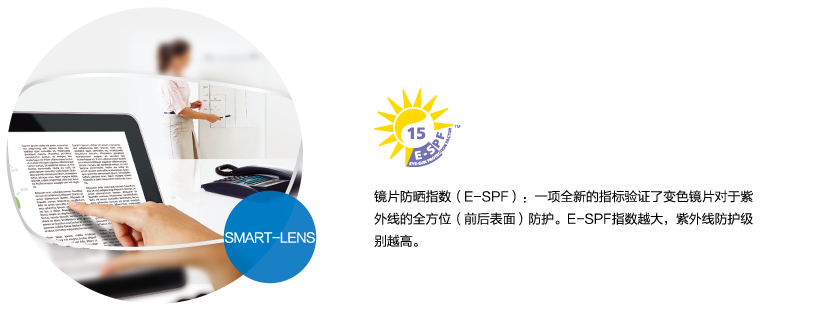 ①双面依视路E SPF 15防晒技术, 更全面阻止紫外线入眼; ②前表面抗蓝光膜层,减少有害蓝光入眼; ③"EASY TO FIT"易适应技术,更快捷的根据年龄匹配产品; |